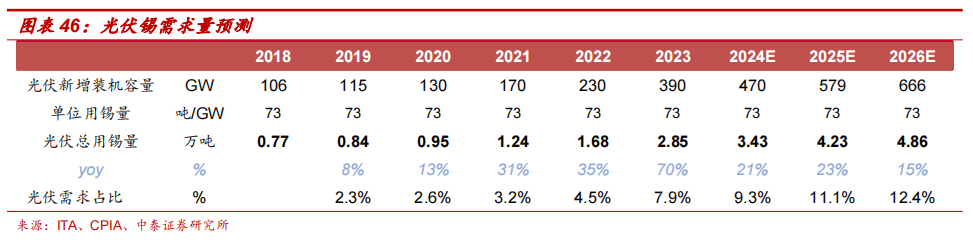 新能源维持高景气,光伏成为锡下游消费重要的增长点。光伏涂锡焊带应用于光伏电池片的串联或并联,发挥导电、聚电作用,通过光伏涂锡焊带连接光伏电池片,在EVA胶膜、光伏玻璃、背膜、边框等其它组件材料一起封装后形成光伏组件,其结构主要由铜基材和锡合金涂层等部分构成。1GW光伏组件所需主流光伏焊带约550吨,按主流Sn60Pb40焊料计算,焊料约占主流焊带质量17%,则1GW光伏装机约消耗锡73吨。假设2026年光伏装机666GW,预计光伏用锡量达到4.86万吨,消费占比提升至12.4%。
