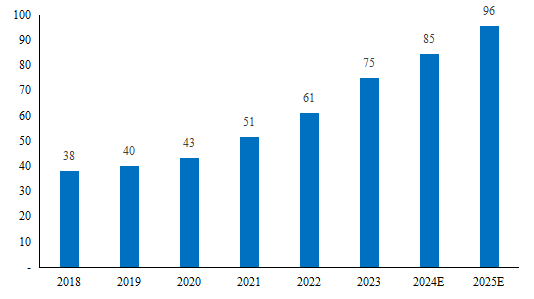 汽车用铝制板带材主要用于车身和新能源汽车的电池包系统冲压零部件,目前为止,新能源汽车的渗透率仍然较低,因此汽车车身铝制板带材使用率整体仍较低,而新能源汽车电池系统受益于新能源纯电汽车的爆发式增长,对电池系统铝制零部件的需求量将大幅提升,因此整体而言汽车用铝板材成长潜力较高。随着汽车轻量化技术进步以及汽车减重需求不断提高,汽车铝制板材需求量也呈现逐年增长的趋势,据中国汽车工业协会2018年至2024年商用车和乘用车销量数据统计及预测,以及国际铝业协会商用车和乘用车单位铝制板材用量数据统计,汽车铝制板材需求从2018年的38万吨增长至2023年的75万吨,预计2025年将增长至95万吨,具体情况如下: