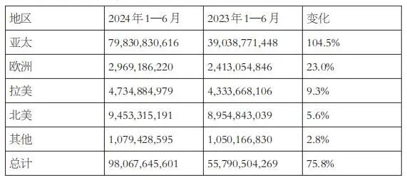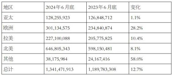 截至2024年6月底,全球总持仓达到了13.41亿手的新高,增幅为12.7%。按照地域来看,北美地区持仓为6.47亿手,同比增长8.1%,占全球持仓总量的48.2%,较2023年同期下降了2.1个百分点;欧洲地区持仓增长了28.2%,达到3.01亿手,以22.4%的市场占有率位居持仓榜第2,较2023年同期上升了2.7个百分点;拉美地区持仓出现了10.4%的增幅,6月底持仓为2.27亿手,较2023年同期持仓增加了2132万手,在全球持仓中的占比微降0.4个百分点。亚太地区继续维持成交占比高、持仓占比低的格局,年中持仓微增了1.1个百分点至1.28亿手,占全球持仓总量的9.6%,较2023年同期下降了1.1%;其他地区6月底持仓为3818万手,增幅高达58.0%。