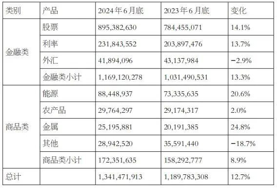 从持仓结构来看,金融类产品占据87.2%的份额,较2023年同期微增0.5个百分点。从各类产品持仓来看,股票、利率、能源和金属类产品期货与期权持仓呈现明显增长势头,2024年6月底持仓量分别为8.95亿手、2.32亿手、8845万手和2520万手,同比分别增长14.1%、13.7%、20.6%和24.8%。但金融类中的外汇产品持仓量持续下降,降幅为2.9%,持仓量从2023年6月底的4314万手降至2024年6月底的4189万手。商品类产品占据12.8%的市场份额,其中农产品类持仓上升了2.0%至2976万手,其他类持仓量大降18.7%至2894万手。