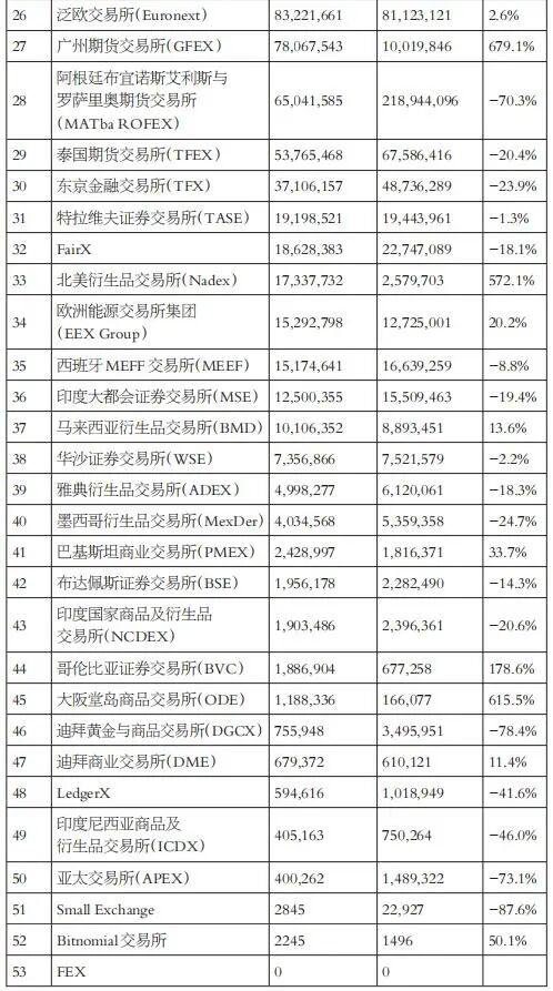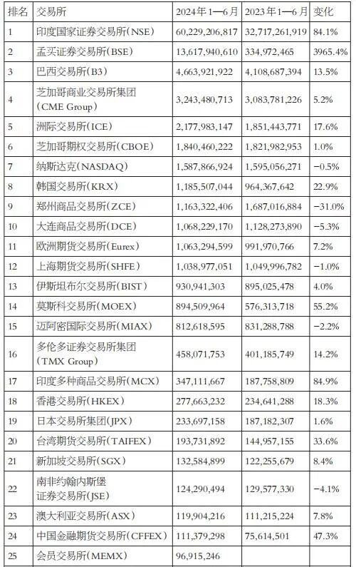 表为2024年上半年全球衍生品交易所成交量排名(单位:手;单边)