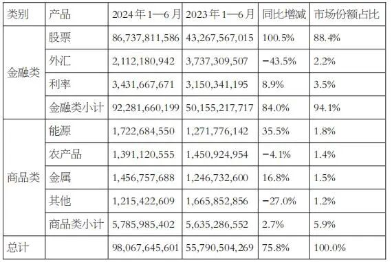 分类别看,上半年,金融期货与期权成交增幅为84.0%,商品期货与期权成交增幅为2.7%,金融期货与期权的增幅是商品期货和期权增幅的31.4倍。金融期货与期权总成交量为922.82亿手,占全球市场份额的94.1%,较2023年同期提升了4.2个百分点;商品期货与期权总成交量为57.86亿手,在全球市场份额占比为5.9%,较2023年同期下降4.2个百分点。
