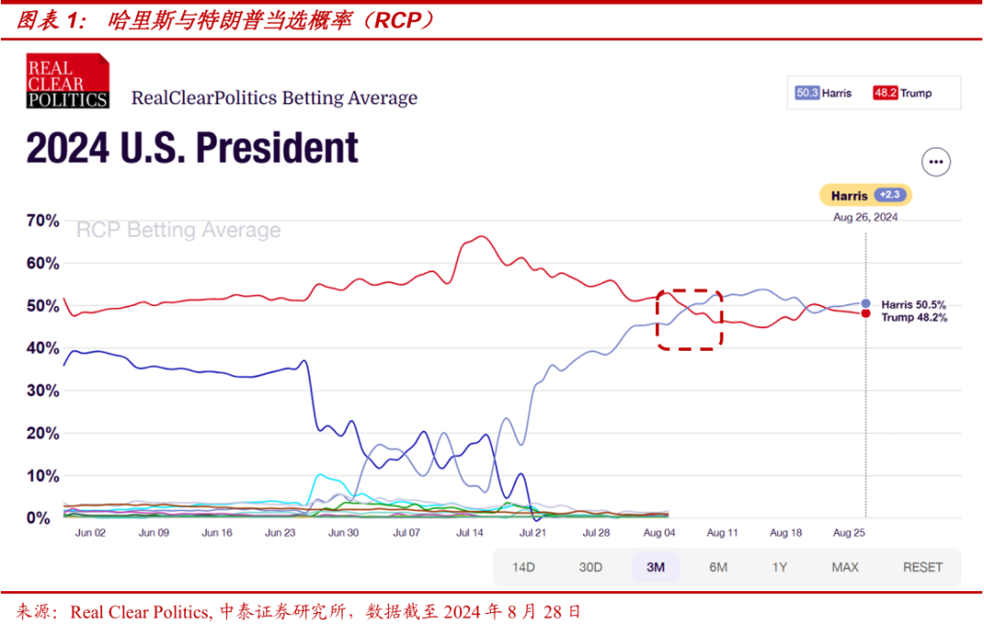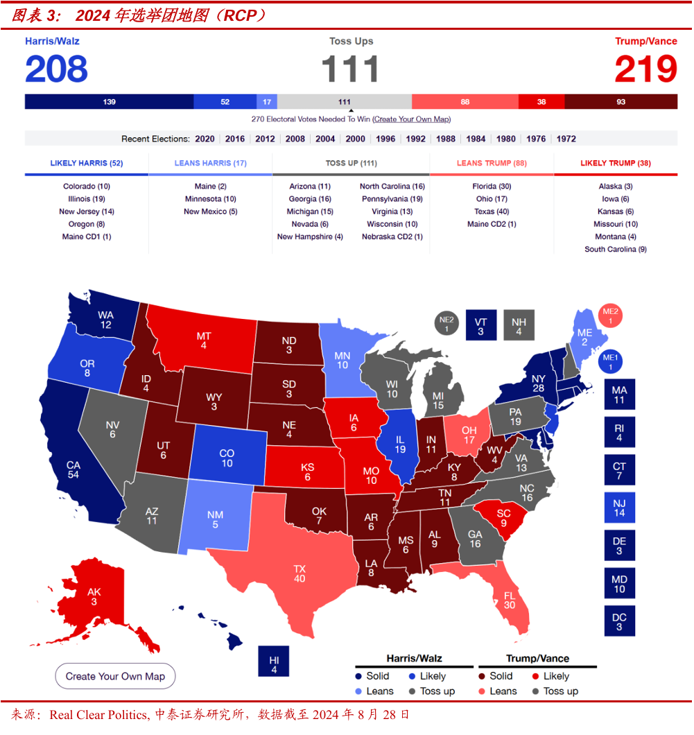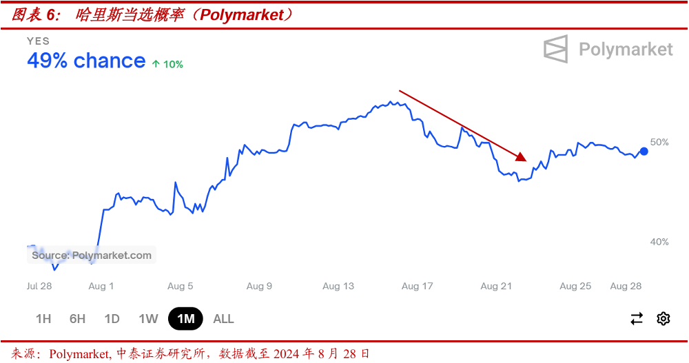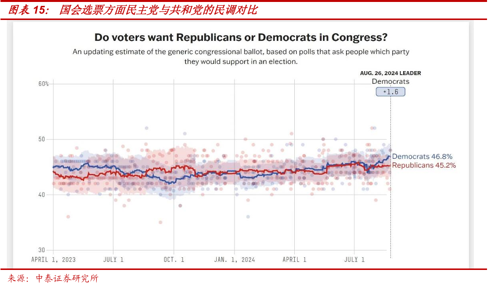 而就市场一种普遍的观点:从历史统计来看,美国总统候选人竞选时的承诺只是为了争取选票的“画饼”,其平均兑现程度只有30%不到,故无需过度关注美国总统大选。我们认为,这一逻辑对于哈里斯或许是适用的:拜登-哈里斯政府的权力基础来自于民主党各路大佬的背书,故当身为美国总统的拜登,尽管自身极不情愿,也不得不被迫退选。而哈里斯的候选人资格由于并非来自初选,其基层选民基础甚至还不如拜登。从这个角度来看,哈里斯无论其政策主张如何“不切实际”,至少其本人是可控和受到较强制约的,这也意味着其政策的“破坏性”亦相对可控。