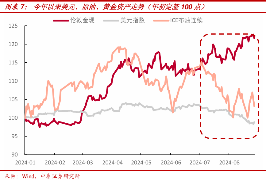 这些经济政策主张与沃尔兹副总统候选人的任命和哈里斯本人在非法移民管控等方面糟糕的记录,更使得其很容易被特朗普贴上“激进左翼”的标签,进而遭到持续攻击和失血。故当哈里斯经济政策主张公布之后,博彩的polymarket网站上,哈里斯的胜率快速下降10%,而全球大类资产亦再度呈现:弱美元、原油,强黄金的“特朗普交易组合”的回归。