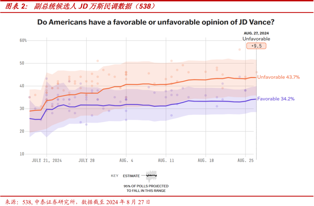 因此,当7月特朗普选择激进并年轻的万斯作为副总统候选人,引发女性中间选民、共和党建制派普遍担忧,并对共和党内乔治亚州、亚利桑那州等关键摇摆州的共和党建制派州长持续人身攻击,强化共和党党内分裂之时,尽管市场因枪击案等一致预期其胜选,我们却坚定的认为,其胜选概率被明显高估。我们当时在文章中指出,拜登退选之后,如果哈里斯选择关键摇摆州的温和派,如:宾夕法尼亚州州长夏皮罗或亚利桑那州参议员凯利作为副手,则哈里斯胜选概率将非常大。