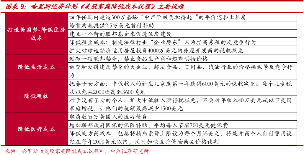 “低物价、低税收、高社会保障”是哈里斯经济政策主张的目标。哈里斯在8月17日北卡罗莱纳州的演讲中公布第一份经济计划《美股家庭降低成本议程》,明确表示其将专注于为中产阶级创造机会,促进中产阶级的经济安全、稳定和尊严。整体来看,其经济政策主张明确体现了"将立场牢固地确立在中产阶级一方"的战略定位。