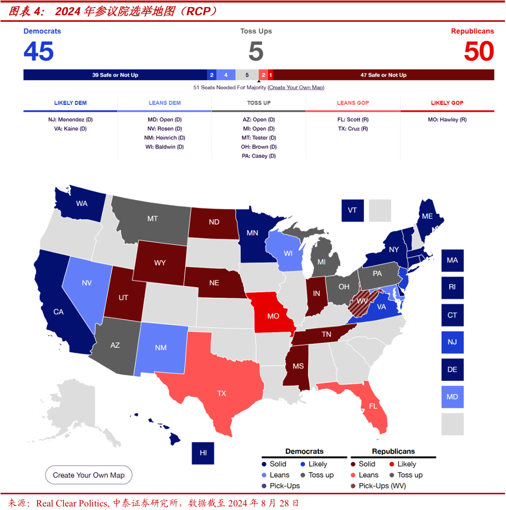 就近期最新民调综合分析看,尽管本次大选中总统选举的胜负自两党候选人组合同时“激进化”后变得愈发难以预料,但参、众两院选举的势头却愈发清晰:民主党夺回对众议院控制的概率一直稳步领先共和党,且近期有势头继续拉大的迹象;相应地,由于这次参议院选举涉及的34个席位中,23个来自民主党,这使得共和党夺回参议院的概率较大,最新的民调显示,共和党或以51:49的微弱优势成为多数党。
