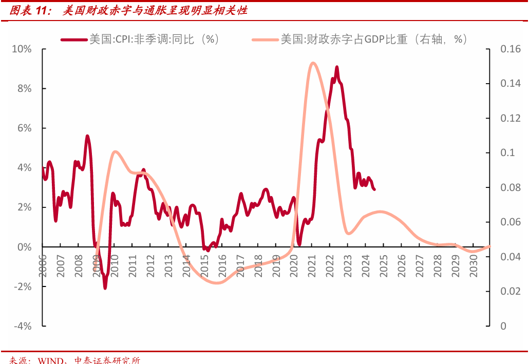 这种大规模的财政扩张可能引发通胀压力, 其作用机理可总结为:政府可能会采取扩张性财政政策,政府支出增加会导致更多资金流入银行系统,促使银行储备金显著上升。信贷供给扩大,从而导致通胀压力加剧。而货币政策方面,为了对抗财政扩张带来的通胀压力,社会利率水平可能会在高位停留较长时间("high for longer"),来对抗这种通胀中枢的中长期抬升。