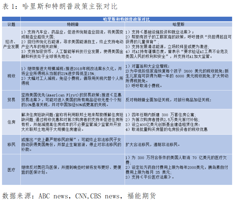 对美国通胀来看,特朗普主张“减税+提高关税+控制移民”的政策组合具有较强的通胀性,进而对大类资产造成影响。若哈里斯胜选,美国经济延续现状的概率更大,其“低物价、低税收、高社会保障”的政策主张所带来的供给侧通胀压力小。