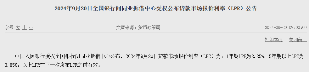 9月20日,中国人民银行(下称“央行”)授权全国银行间同业拆借中心公布了新一期贷款市场报价利率(LPR)。其中,1年期LPR为3.35%,上月为3.35%;5年期以上LPR为3.85%,上月为3.85%,维持上期报价不变。