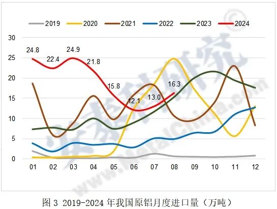 1-8月,我国累计进口原铝151.3万吨,同比增长100.5%,其中自俄罗斯进口占比49.0%;累计出口6.2万吨,同比下降41.3%。