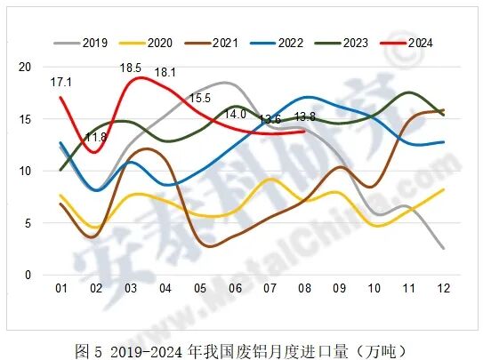 1-8月,我国累计进口废铝122.0万吨,同比增长8.9%。