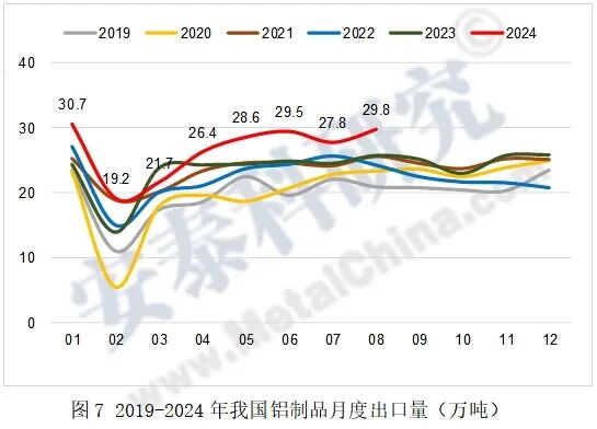七、铝制品出口环比增长。8月我国铝制品出口29.8万吨,环比增长7.2%,同比增长16.3%。