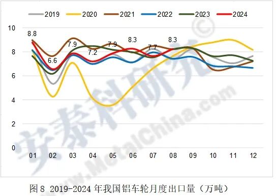 1-8月,我国累计出口铝合金车轮62.6万吨,同比增长0.3%。
