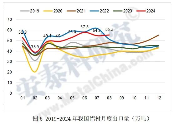 1-8月,我国累计出口铝制品213.6万吨,同比增长15.7%。其中,向美国累计出口36.0万吨,同比增长23.3%;向澳大利亚累计出口11.5万吨,同比增长12.6%。预计2024年我国铝制品出口将首次突破300万吨。