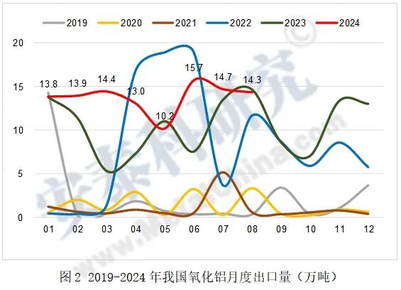 1-8月,我国累计进口氧化铝126.2万吨,同比增长10.7%;累计出口110.1万吨,同比增长30.6%。