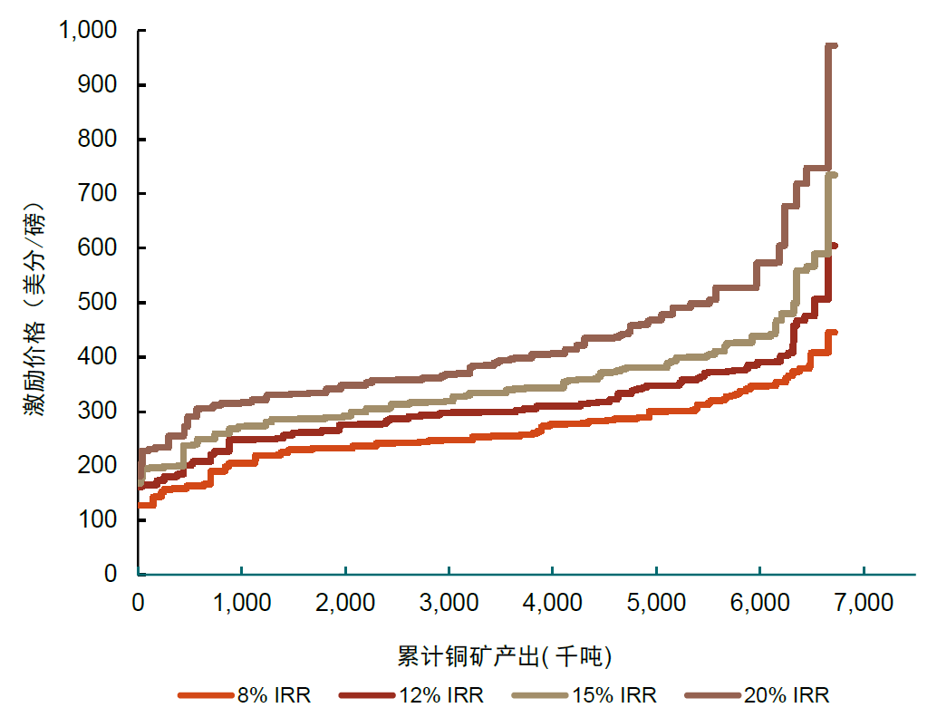 从增量角度来看,未来潜在的铜矿大多为绿地项目,所需的初始资本投入趋于上升,如图表所示,Baimskaya、El Abra等远期大型项目初始资本开支强度高达2.5万美元/年产吨铜。且未来的项目大多分布在政治动荡、基建薄弱的国家和地区,因此激励价格中所需风险补偿大幅提升。根据WoodMac的测算,IRR=15%的基准情形下,铜矿激励价格高达4.85美分/磅(折合10689美元/每吨)。