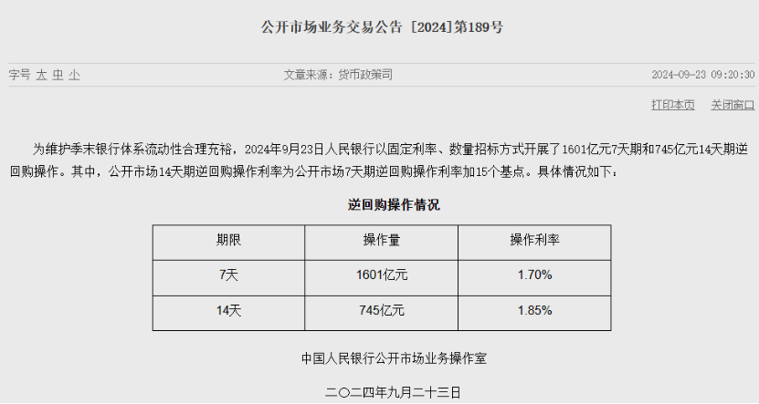 9月23日,为维护季末银行体系流动性合理充裕,人民银行(下称“央行”)以固定利率、数量招标方式开展了1601亿元7天期和745亿元14天期逆回购操作。当天公布的公开市场7天期逆回购操作利率为1.7%,与上期持平。公开市场14天期逆回购操作利率为1.85%,上期为1.95%。