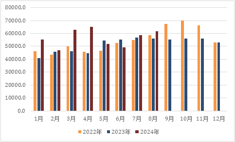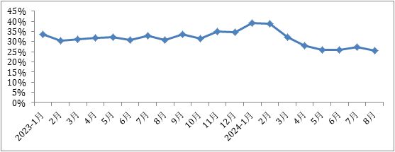 硫酸钴(三元材料的生产原料)生产仍在收缩。根据SMM统计,2024年8月,国内硫酸钴产量为0.50万吨,同比下降33%,环比减少6%,1-8月累计产量为4.17万吨,同比减少27%,生产仍呈现持续收缩的特征。