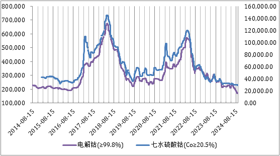 8月中以来,钴市场继续破位下行。9月中(9月13日),电解钴价格(≥99.8%,上海有色现货均价)收于17万元/吨,相比上月同期的18.5万元/吨累计下跌8.1%,钴价跌破长期底部支撑位后,连续创下上海有色电解钴价格上市以来的新低;七水硫酸钴价格(钴≥20.5%)收于2.92万元/吨,相比上月同期的2.98万元/吨累计下跌2%。