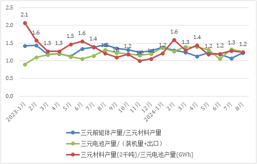 为了更直观了解三元电池产业链生产及库存变化情况,我们跟踪了三元电池产量/(装机量+出口)、三元材料产量(2千吨)/三元电池产量(GWh)、三元前驱体产量/三元材料产量等3个比值的变化情况,从中可以看到,8月三元电池的生产继续保持相对高位,但相对于上月略有放缓;三元材料生产相对于三元电池大体稳定,基本保持同步,而三元前驱体领域的反应滞后了一个月,产量开始明显回升。