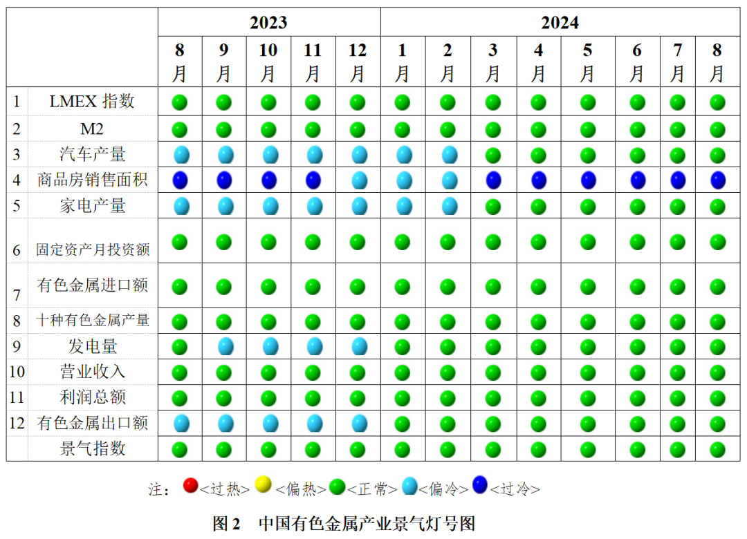 在构成有色金属产业景气指数的12项指标中,LMEX指数、M2、汽车产量、家电产量、有色金属固定资产月投资额、有色金属进口额、营业收入、十种有色金属产量、发电量指标、利润总额及有色金属出口额等11项指标位于“正常”区间;商品房销售面积指标位于“过冷”区间。