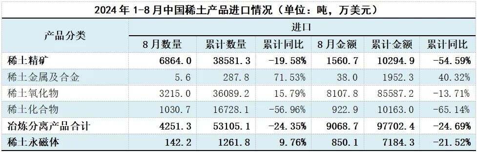 四、1-8月稀土冶炼分离产品进口量同比下降近24.4%