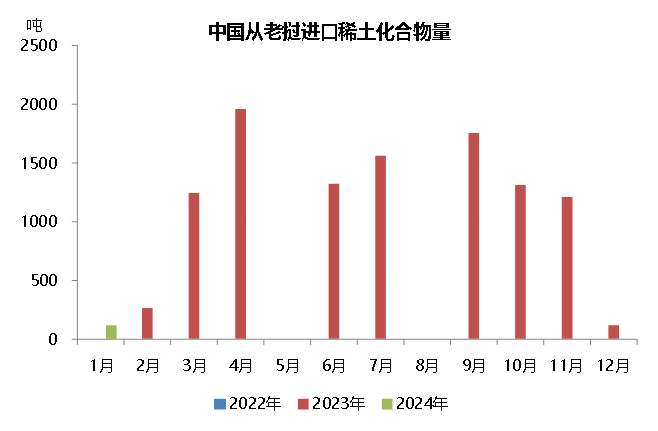 2023年2月以来,我国开始从老挝进口稀土氧化物和化合物。2024年1-8月份,我国从老挝进口5900吨稀土氧化物,同比下降7.1%,占同期氧化物总进口量的16.3%,进口品种全部为“未列名氧化稀土”;8月,老挝稀土氧化物进口量为845吨,环比增加5.8%,去年同期未有进口。今年以来,我国仅1月份从老挝进口115吨稀土化合物。