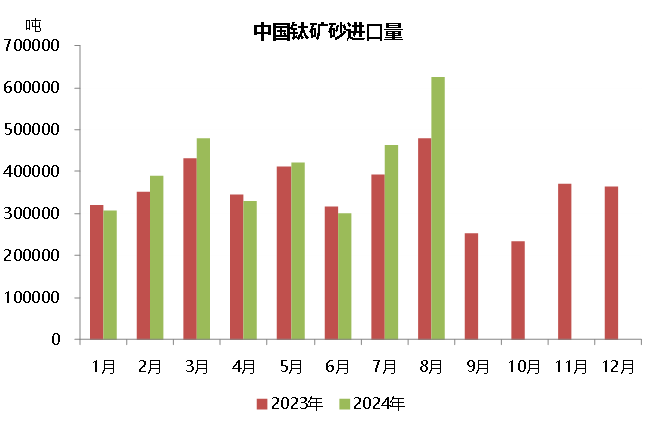 三、1-8月钛矿砂和锆英砂进口量同比维持增长