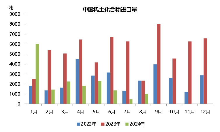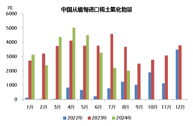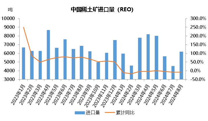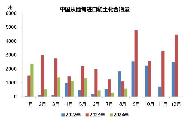 2024年1-8月份,我国从缅甸进口2.7万吨稀土氧化物,同比下降9%,占同期氧化物总进口量的74.5%,进口品种全部为“未列名氧化稀土”;1-8月,我国从缅甸进口8088吨稀土化合物,同比减少47.2%,占比达48.4%,进口品种全部为“其他未列名稀土金属及其混合物的化合物”。据测算,今年前8个月,我国从缅甸进口的稀土原料中(稀土氧化物和稀土化合物),REO总含量同比下降约13.2%。