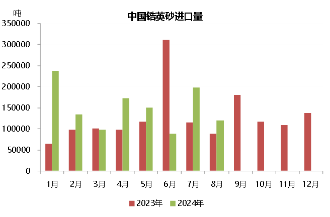 2024年1-8月份,我国进口120万吨锆英砂,同比增长21%。其中,8月份,锆英砂进口量为12万吨,环比减少39.4%,同比增长37.5%。