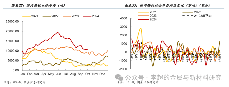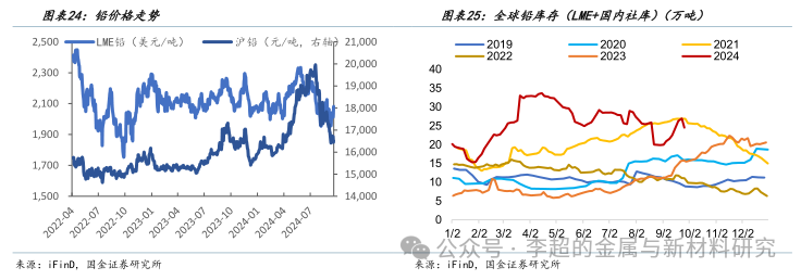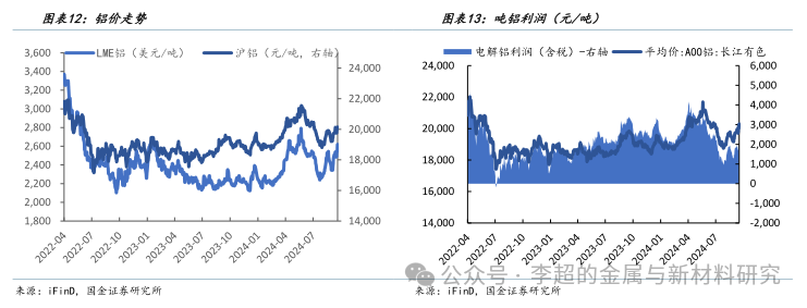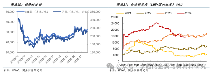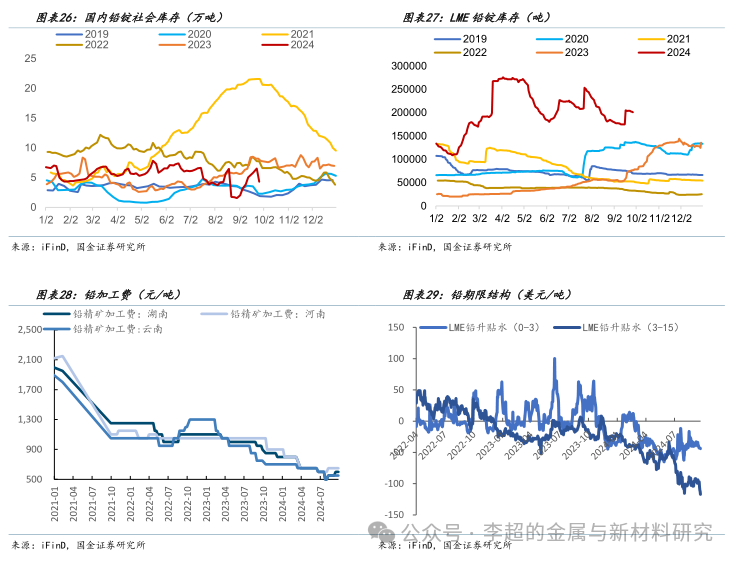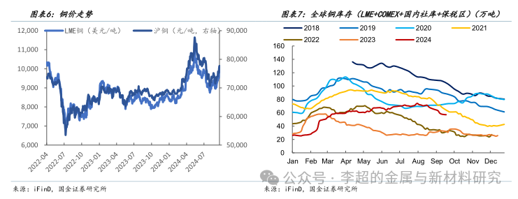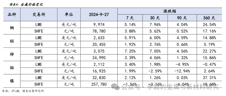 铜:本周LME铜价格+5.14%至9974美元/吨,沪铜价格+3.88%至7.88万元/吨。全球铜去库2.31万吨至57.17万吨,其中LME+COMEX累库1.84万吨至35.89万吨,国内社库+保税区去库4.15万吨至21.28万吨。本周国内引导降低存量房贷利率,政治局会议释放利好信号,央行降息、降准落地,政策利率降幅近四年来最大,铜价持续上行。供应端,本周CSPT敲定Q4铜精矿现货TC指导价为35美元/干吨,较Q3指导价30美元/干吨上调,本周进口铜精矿零单TC为6.47美元/吨,环比+1.79美元/吨。后续矿端供需仍有收紧趋势,一方面是本周赞比亚Kansanshi矿由于事故暂停运营;另一方面是印尼自由港及Amman旗下冶炼厂开工投产,冶炼厂爬产完成后印尼或将停止对海外出口铜矿,导致全球铜矿供需进一步趋紧。而再生铜原料暂不明朗,冶炼厂面临原料限制,10月开始检修增加、大冶铜厂火灾导致停产将导致精铜产量下滑。消费端,本周精铜杆开工率84.92%,环比+5.60%,增量来自假期检修的恢复,但铜价上行也部分抑制消费表现;本周线缆开工率91.96%,环比-2.92%,部分因铜价上涨导致订单走弱,整体上大型企业订单充足,部分小企业出口订单较好。供需边际改善有望继续驱动铜价上行。在下半年矿端紧缩预期加强以及再生铜增量贡献减弱的背景下,预计Q4铜价中枢有望上移。节奏方面,二季度消费旺季下,需求因素对定价作用较小,而国内三季度消费淡季需求定价占比将有所上升,国内社库的顺利去化需要考虑下游对价格的承接力度,价格的小幅调整或更有利于国内社库逐步去化,8-9月冶炼端原料短缺及废铜隐忧或将发酵,Q4价格有望引来新一轮上涨。