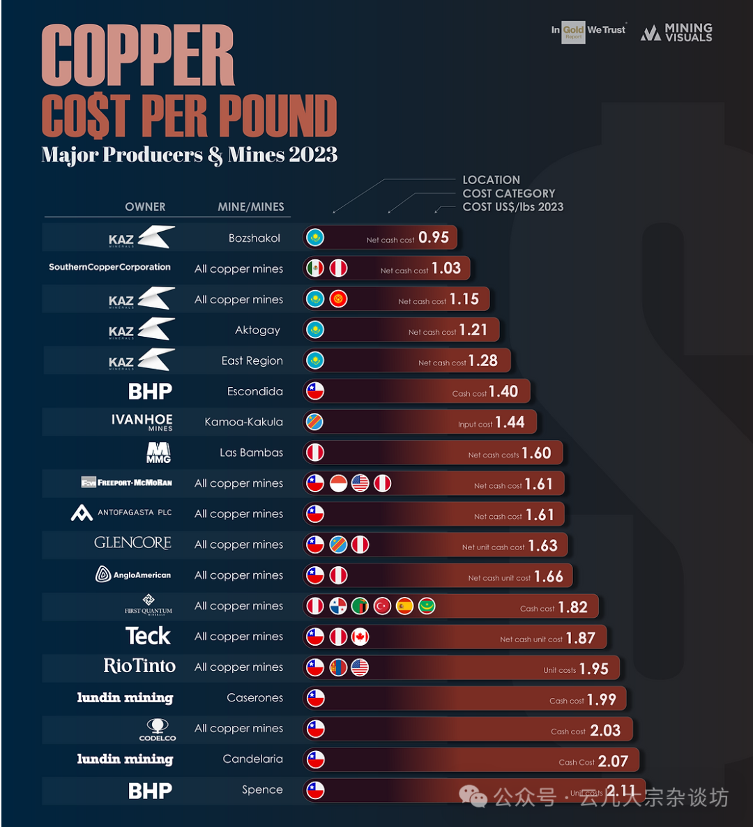 这幅图表展示了2023年全球各大矿山和公司之间的铜生产成本。全球成本差异显著,其中哈萨克斯坦、秘鲁、墨西哥和刚果民主共和国(DRC)等地区因成本效益突出而备受关注。每磅铜的生产成本从哈萨克斯坦KAZ Minerals公司Bozshakol矿的最低0.95美元到BHP和Lundin Mining等公司运营的矿山超过2.00美元不等。这些差异反映了资源可获取性、基础设施和劳动力等区域因素对矿业开支的影响。