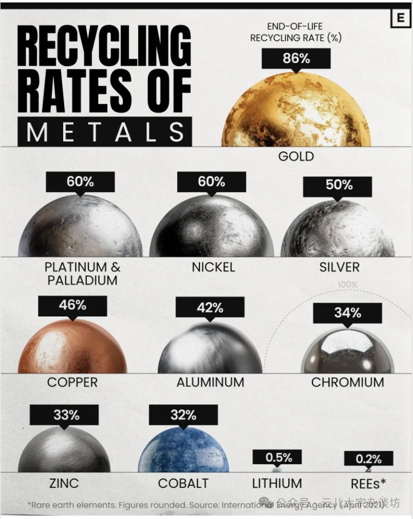 不同金属的“生命周期结束回收率”(End-of-Life Recycling Rate,EOL-RR),即在其使用寿命结束后能够被回收利用的比例。数据来源于国际能源署(IEA)。