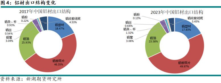 2010年铝型材出口量占比一度超34%,但到2011年则将至28%以下,这其中美国对中国铝型材的反补贴税率政策是最大影响。之后国内铝型材企业寻求迂回战术,通过在海外建厂,将国内生产的铝型材简单处理后再发往美国,因此2011-2016年铝型材出库量仍维持在20-30%的权重。2017年以来,铝板带出口量不断增加,铝型材出口量增加则不明显,其在铝材出口中的占比则明显下降,近几年基本维持在17%上下。2017年以来,出口结构基本稳定,其中铝板带片出口量基本维持在50%的比重,铝箔在25%左右。