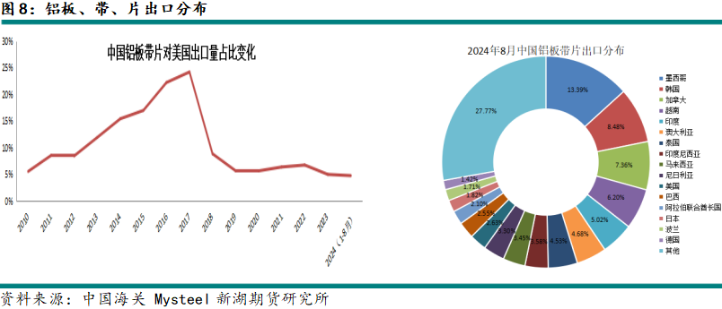 近期以色列对黎巴嫩通讯设施安装炸药导致大规模爆炸伤亡事件,引发中东地区对美欧供应链的不信任,对中国商品向中东地区出口有促进作用,或为铝及其制品出口拓展空间。此外随着“一带一路”的推进,非洲市场也将成为中国铝出口的主要增长点。