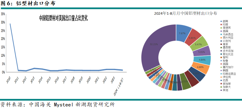 铝型材是最早受到海外反倾销、反补贴政策影响较大的出口商品。2009年6月及2010年9月澳大利亚及美国先后对中国铝型材反倾销、反补贴税率措施,其中美国的反补税率高达137%,直接使得中国铝型材供应商告别美国市场。在此之前,中国铝型材对美国出口量占比接近30%,为第一大出口目的国。虽然2011年后输美铝型材降至冰点,但中国铝型材出口增长态势并未结束。2010年铝型材出口量在61.6万吨,2011年则攀升至83万吨,2012年达85万吨。2013年出口量短暂回落至61万吨后,2014年重回85万吨,2015年出口量则创历史新高达到118.9万吨,之后回落,近今年出口量基本在95万吨水平。2024年前8个月累计出库量达到70.9万吨,全年出口量有望再度达到100万吨。
