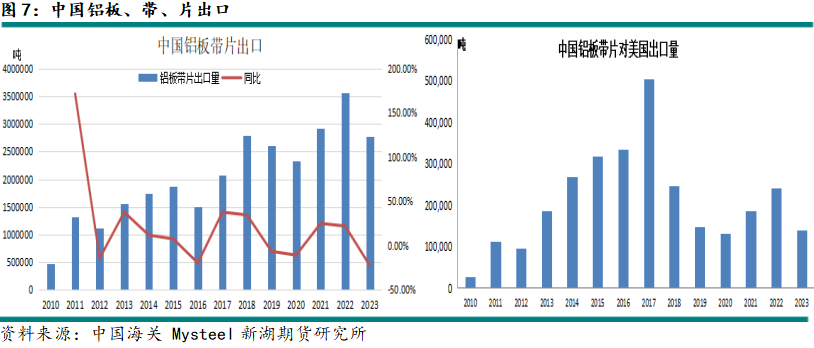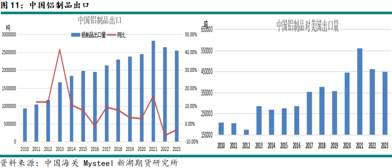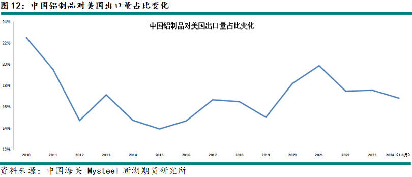 2024年9月18日美国贸易办公室发布公告,确定将大幅度扩大和上调中国产品的进口关税,包括将电动汽车关税提高100%,太阳能电池的关税税率将上调至50%,电动汽车电池、关键矿产、钢铁、铝、口罩和岸边集装箱起重机的关税税率将上调至25%。同时,美国将中国半导体的进口关税提高50%,此新税率将于2025年1月开始生效。美国此举再度为中国铝出口设置障碍。不过美欧重重设阻并不能阻挡中国铝出口的步伐。中国铝出口增加是全球铝市场供应结构重构的结果,而新兴市场也将为中国铝出口提高增长空间。