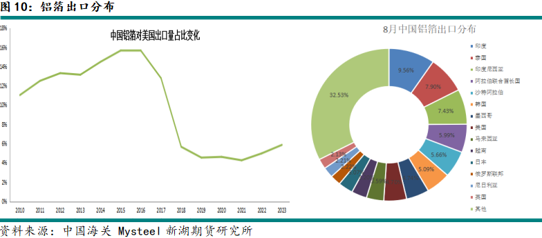 美国是中国铝箔主要进口国,其进口量从2010年的5.5万吨逐步攀升至15万吨水平,占比也从11%攀升至15%。中国铝箔对美出口量不断增加引发美国相关企业的担忧,并要求美国商务部施加阻碍。2017年8月和10月,美国商务部先后对进口中国铝箔做出反补贴和反倾销初裁,合计临时征收的双反税率范围在113.37%-243.21%。这使得中国输美铝箔快速下降7万吨水平,占比也回落至5%上下。