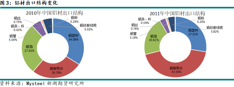 铝材出口以铝板带、铝箔、铝型材为主,三项出口量占总出口的90%以上。2010年虽然铝板带、铝箔及铝型材三项出口总量占比变化不大,但其各自比重却有较大变化。