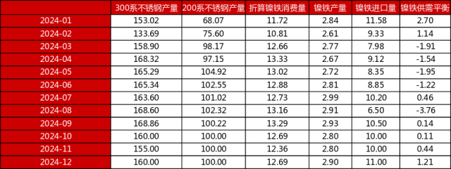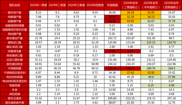 全球来看,对于2024年的供需我们进行了调整,供给端,增量部分在印尼NPI+MHP+冰镍+国内电积镍,减量在国内镍铁以及澳大利亚、新喀里多尼亚的部分项目的减、停产,增量部分考虑到上半年印尼镍矿RKAB审批速度较慢,部分NPI项目放缓了投产速度,所以我们对于印尼NPI产量进行了下调,国内电积镍产量进行了上调;减量部分国内镍铁由于利润因素有超预期减产,所以总产量进一步进行了下调;澳大利亚的第一量子、BHP以及新喀里多尼亚的嘉能可项目的停产我们将减量进行了进一步下调,最终总供应相较去年增加22万吨;需求端,国内300系不锈钢产量同比增速目前为止仅有不足3%,略差于年初预期,所以不锈钢用镍量维持年初的8万吨耗镍增量预期,而中国以外地区主要增量在印尼,印尼年内不锈钢产量预期同比增速22%,耗镍量预计增加8万吨上下;新能源电池用镍,今年汽车增速虽然符合年初预期,但由于混动占比的增加,带电量需求未能同等增加,也就意味着对于硫酸镍的需求未能同等速度增加,从中国前8个月的电池耗镍量数据来看,电池耗镍量同比减少,我们暂时维持电池未能提供增速计算,也就是需求端增加16万吨的增量。总体看今年依旧维持过剩格局,且过剩量有扩大趋势,明细看,过剩量逐渐从镍铁向精炼镍转移。