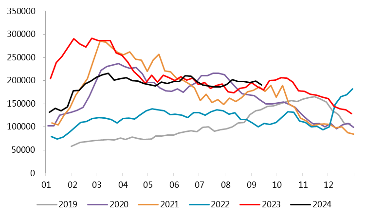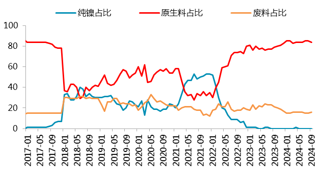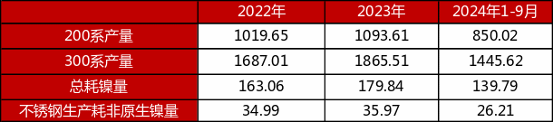 整体看,今年前三个季度总产量2824.28万吨,同比增长6.16%,其中200系850.02万吨,同比增长4.57%;300系1445.62万吨,同比增长2.71%;400系528.64万吨,同比增长20.18%。不锈钢生产对于原生镍的消耗累计139.79万吨,由于性价比问题,对废不锈钢使用占比下降,对原生镍的消耗量较大,累计消耗原生镍113.58万吨。年内预计不锈钢耗镍总量186.18万吨,同比增长3.5%。