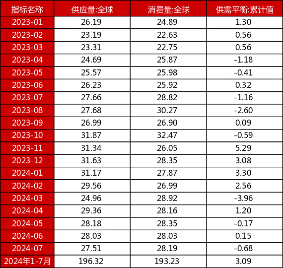 世界金属统计局(WBMS)公布的最新报告显示,2024年7月,全球精炼镍产量为27.51万吨,消费量为28.19万吨,供应短缺0.68万吨。1-7月,全球精炼镍产量为196.32万吨,消费量为193.23万吨,供应过剩3.09万吨。2024年7月,全球镍矿产量为32.86万吨。