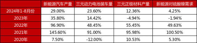 新能源产业链条来看,今年前8个月新能源产业链条各个环节的增速如先前预期三元正极材料产量以及三元动力电池装车量与新能源汽车产销增速持续拉大距离。相较前五个月的数据,新能源汽车产量同比增速收窄一个百分点,三元动力电池装车量以及三元正极材料产量同比数据以及新能源汽车对于硫酸镍的消耗同比均有10个百分点以上的下降。三元动力电池装车量增速与新能源汽车产量曾都不匹配是由于三元动力电池市场份额下降导致的,三元正极材料以及对于硫酸镍的消耗与之不匹配是由于库存管理因素导致的。