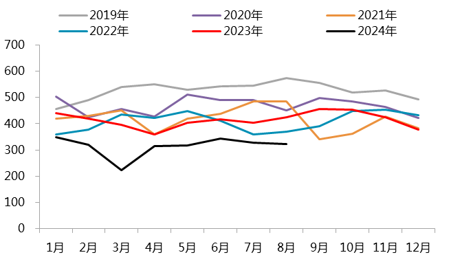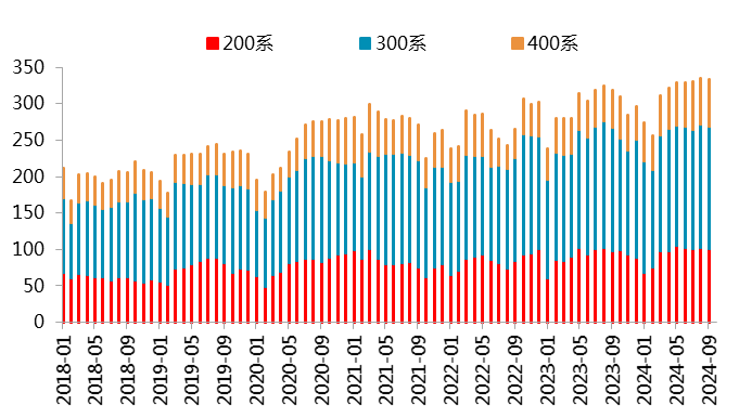 根据钢联数据,8月国内43家不锈钢厂粗钢产量335.91万吨,环比增幅1.54%,同比增加3.19%,其中:200系102.32万吨,月环比增幅1.29%,同比增加0.98%;300系168.6万吨,月环比增幅3.06%,同比减少3.65%;400系64.99万吨,月环比减幅1.84%,同比增加32.04%。