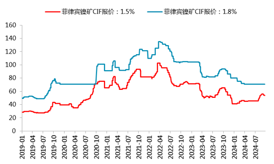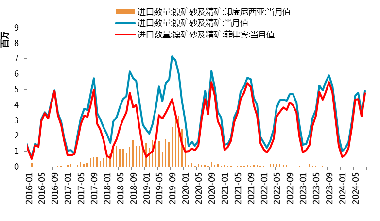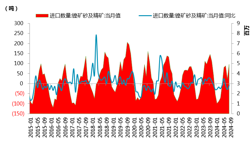据中国海关数据统计,2024年8月镍矿进口量493.07万吨,环比增加144.56万吨,增幅41.48%;同比减少59.66万吨,降幅10.79%。其中红土镍矿488.49万吨,硫化镍矿4.58万吨。自菲律宾进口红土镍矿477.02万吨,占本月进口量的96.75%。1-8月镍矿进口总量2454.52万吨,同比减少11.66%。