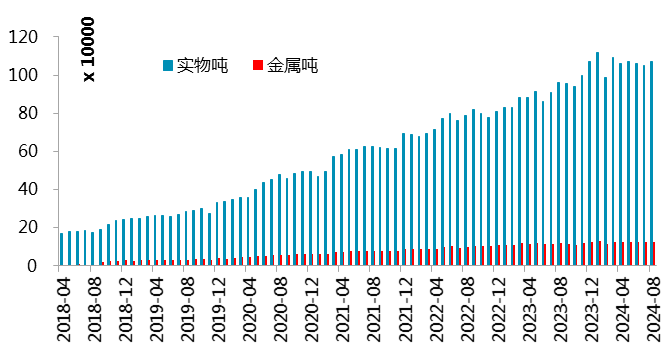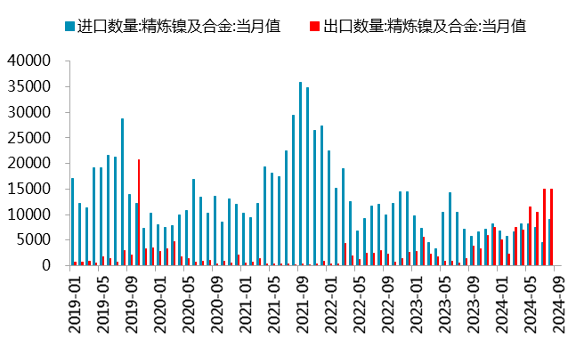 根据上海有色数据,8月全国精炼镍产量共计2.92万吨,环比增加1.21%,同比上升33.94%。预计9月全国精炼镍产量2.95万吨,1-9月总产量23.93万吨,同比增幅38.06%。自去年国内精炼镍供需发生根本性转变后,国内精炼镍新增产能新增持续高位,虽然个别企业检修停产,但由于新增产能的释放,国内精炼镍增量明显。