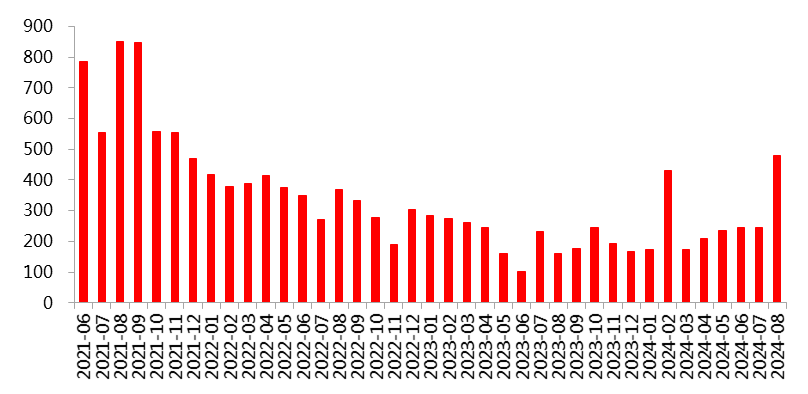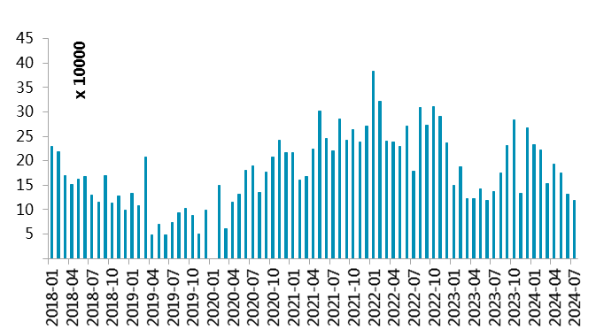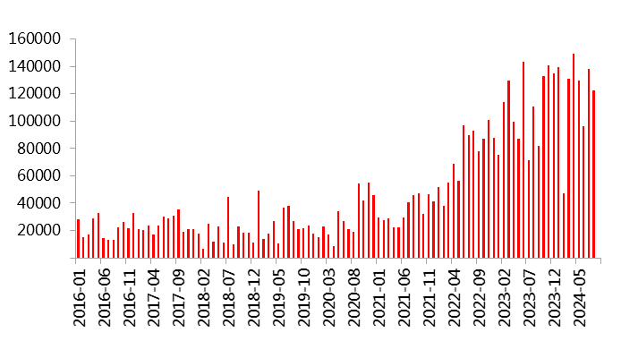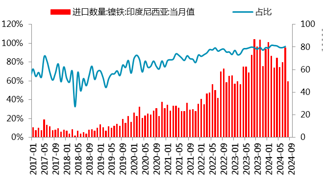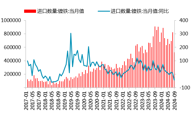 据中国海关数据统计,2024年8月中国镍铁进口量52.2万吨,环比减少29.9万吨,降幅36.4%,同比减少38.8万吨,降幅42.6%。其中,8月中国自印尼进口镍铁量49.6万吨环比减少29.7万吨,降幅37.5%,同比减少37.1万吨,降幅42.8%。1-8月中国镍铁进口总量567.1万吨,同比增加47.5万吨,增幅9.1%。其中,自印尼进口镍铁量545.5万吨,同比增加60.9万吨,增幅12.6%。