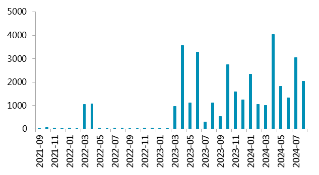 8月印尼镍铁(NPI&FeNi)产量约1069600实物吨(124520金属吨),环比增幅约1%。1-8月印尼累计生产镍铁99.39万吨,同比增幅8.08%。印尼1-8月累计投产27台矿热炉,累计年度产能33万吨,今年6月开始,纳德思科镍业以及硕石项目投产,加速了当地NPI项目的上马。印尼当地的镍铁出口格局也发生了变化,去年以前当地NPI除了满足当地不锈钢厂原料使用外,大部分回流至国内,今年由于印尼镍产量激增,迫使其他国家的工厂关闭,欧洲不锈钢制造商正转向印尼采购镍。根据安泰科数据,印尼镍生铁出口到欧洲的数量已从2023 年的1006 吨激增至今年的87485吨。数据显示,这些产品主要流向荷兰、意大利和英国等欧州国家。