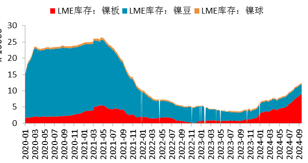 三季度,LME库存持续增长,从二季度末的90906吨增长至当前的124140吨,增长33234吨,从明细看,其中镍板从二季度末的52902吨增加至当前的89214吨,增长36312吨;镍豆从二季度末的32568吨增长至当前的34212吨,增长2106吨。国内库存从二季度末的29579吨增至当前的29895吨,基本持平,因为国内在三季度经历了库存的下降后回升,主要是由于精炼镍出口盈利窗口打开后再次趋于关闭。总体看,国内外总库存是持续增加的,主要由于国内电积镍产能的持续释放以及消费的持续疲弱。